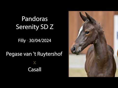 Met een pedigree van Pegase Vant Ruytershof x Casall Ask x Chin Chin, is dit veulen voorbestemd om indruk te maken. Pegase Vant Ruytershof heeft zich al bewezen als een van de meest gewilde, opkomende hengsten in de sport. Casall Ask, bekend om zijn talloze Grand Prix-overwinningen, brengt een afstamming van uithoudingsvermogen en precisie, terwijl Chin Chin, een Olympische ster, een erfenis van kracht en behendigheid toevoegt. Pandoras Serenity SD Z garandeert een toekomst vol overwinningen voor dit veelbelovende veulen.
